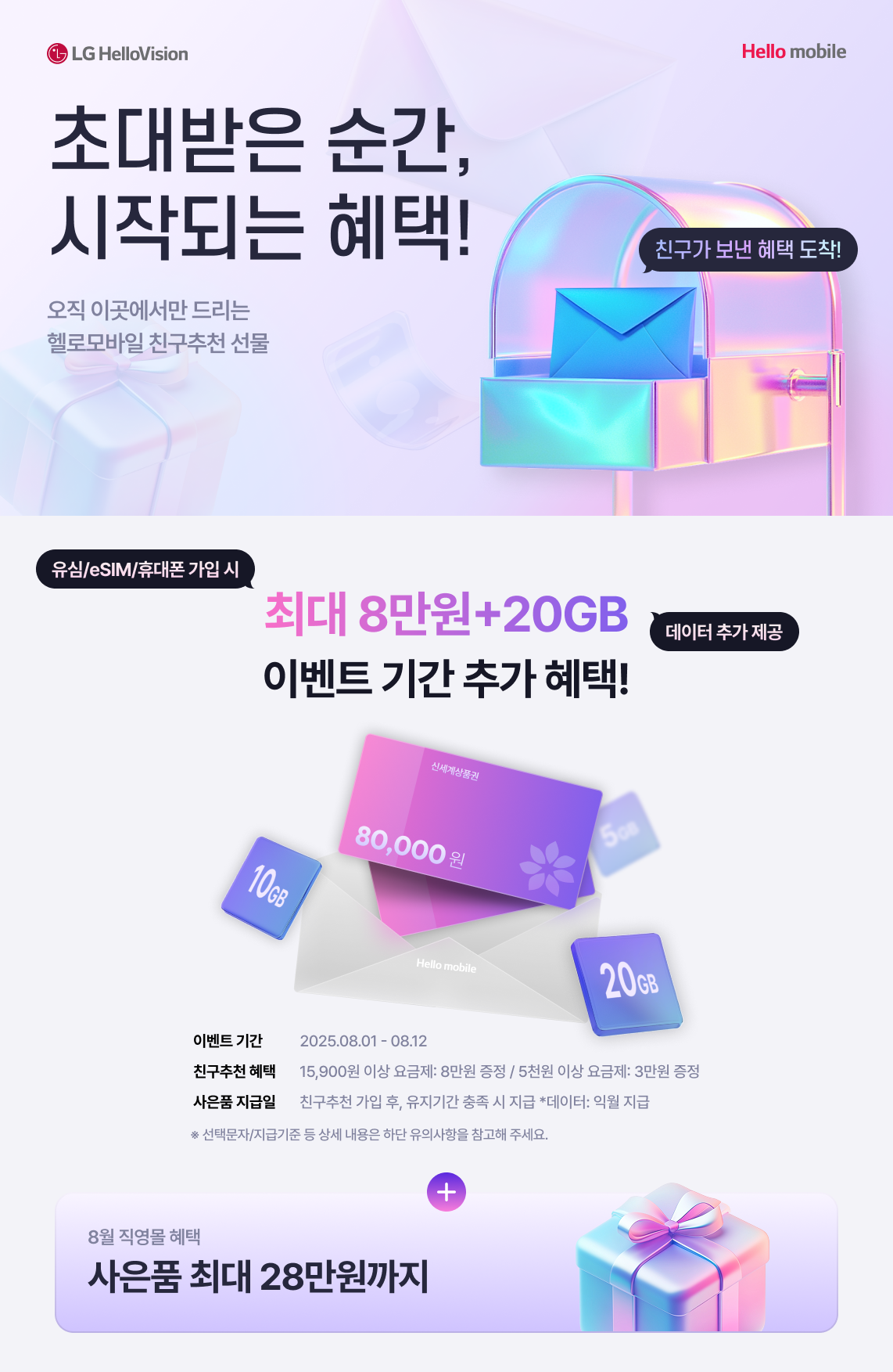 * 2만원 증정 : 5,000원 이상 15,900원 미만 요금제로 8/1~8/12 개통한 고객님