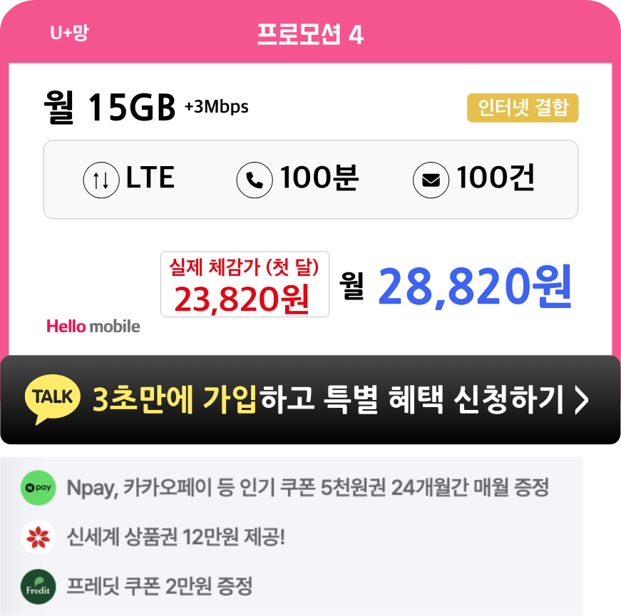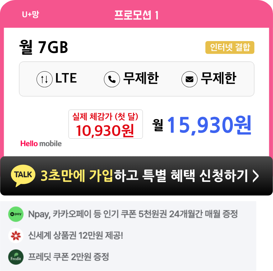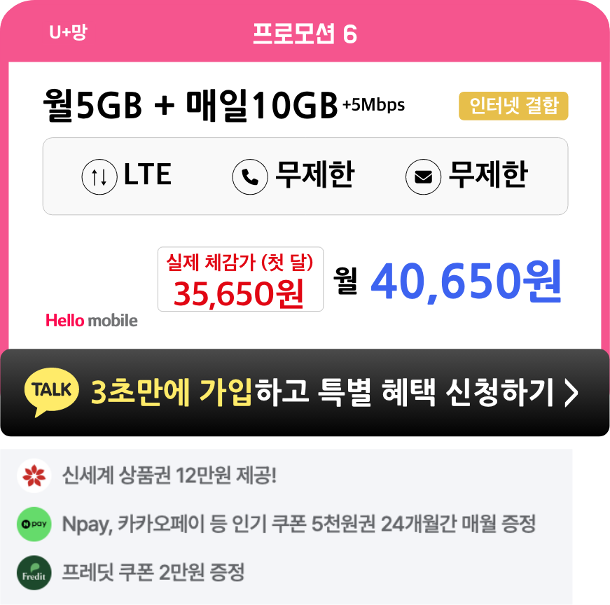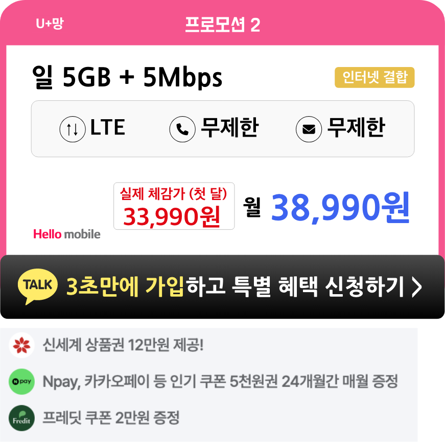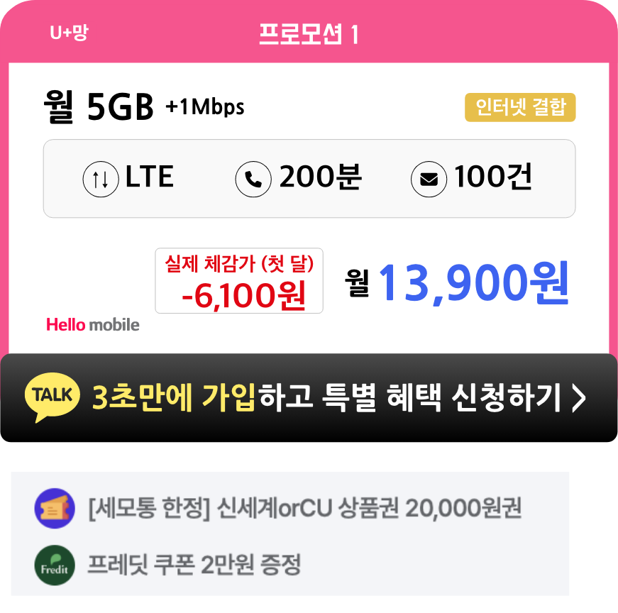 - 헬로모바일 전체 요금제 가입 시, 4개월간 매월 5천원씩 총 2만원 상품권이 증정됩니다.