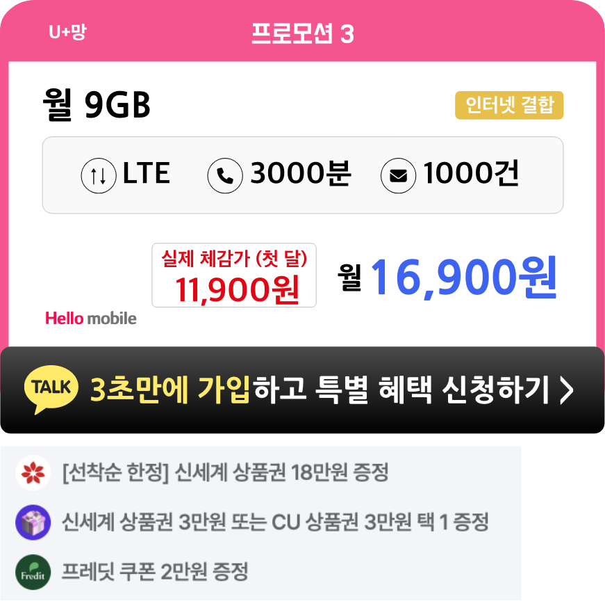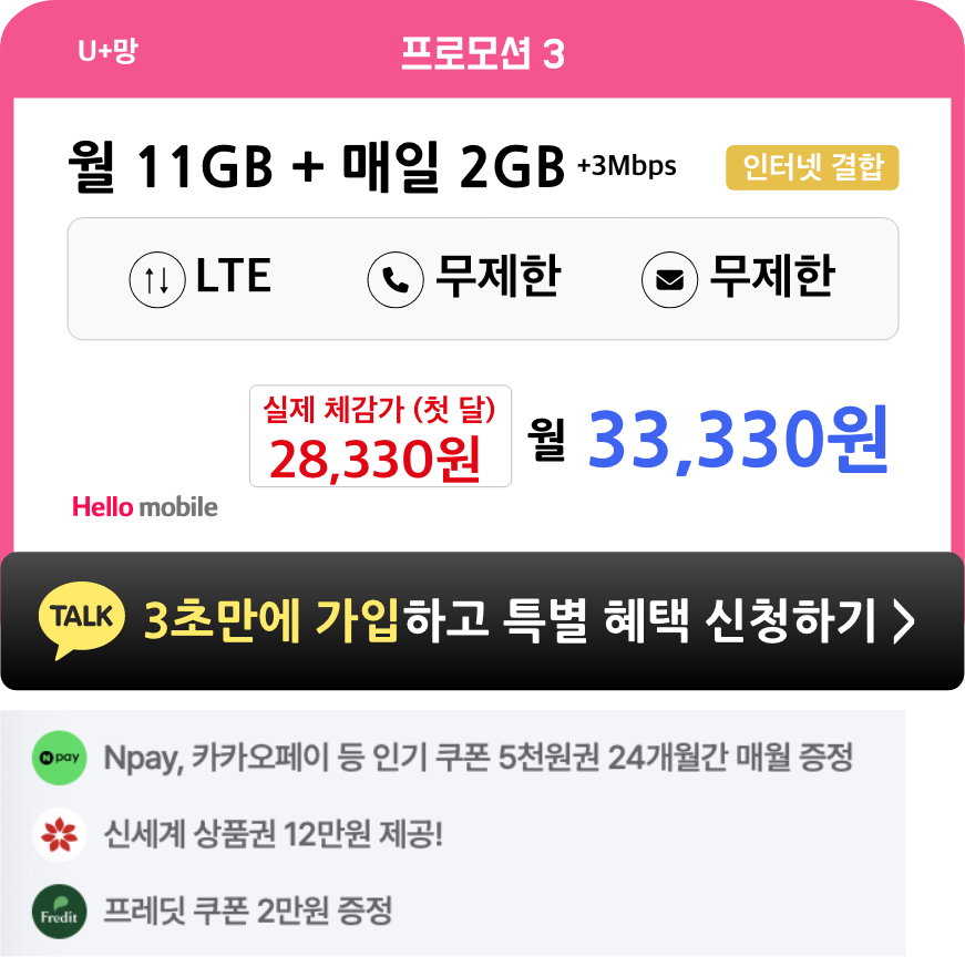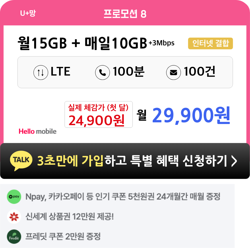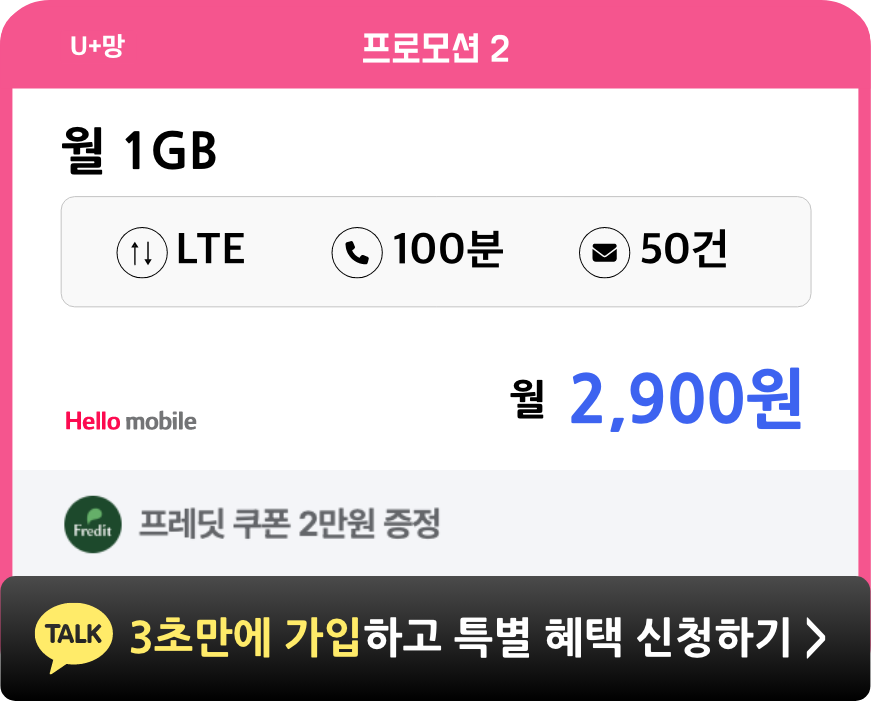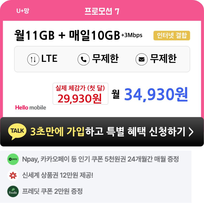 - 헬로모바일 전체 요금제 가입 시, 4개월간 매월 5천원씩 총 2만원 상품권이 증정됩니다.
